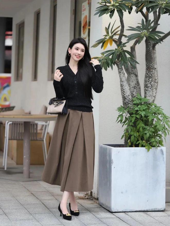 在这个温暖的秋日午后,黑色的针织衫简洁而温暖,搭配经典的卡其色长裙,整体造型尽显女性温婉的气质。走在宁静的街道上,脚步轻盈,每一步都像是在与秋风低语,沉浸在这份自然的美好之中。▼