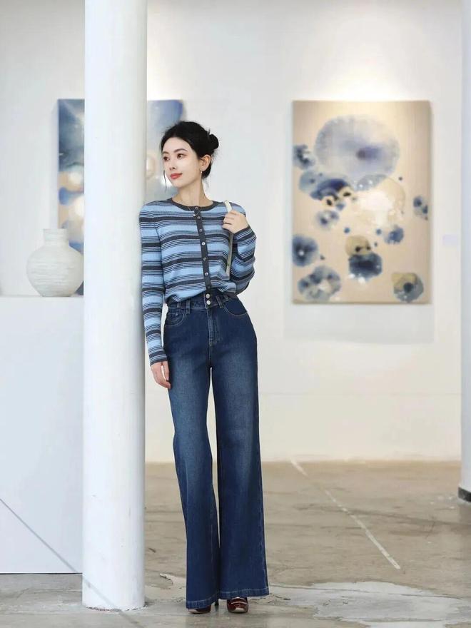 在艺术馆的静谧空间里,蓝色与白色的搭配仿佛画布上的清新一笔。条纹的设计为这身搭配增添了一丝活力,而宽松的牛仔裤又带着一种悠闲的味道。仿佛与周围的艺术作品融为一体,充满了秋日的雅致。▼