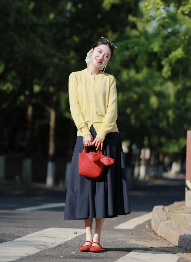 秋天的气息在公园的宁静中愈发显得温柔,的针织衫与深蓝色的裙子相互呼应,红色小包与鞋子点亮了整个搭配。阳光透过树叶洒在身上,每一抹光线都与秋天的色彩交织,呈现出一种温暖又生动的秋日风情。▼