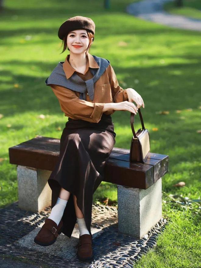 在公园的长椅上,温暖的阳光洒在身上,棕色的衬衫与深色裙子的搭配展现出一种简约而又优雅的气质。深色鞋与简约的包包为整体造型增添了一丝精致感,站在这片绿意盎然的草地上,散发着温暖和安宁。▼