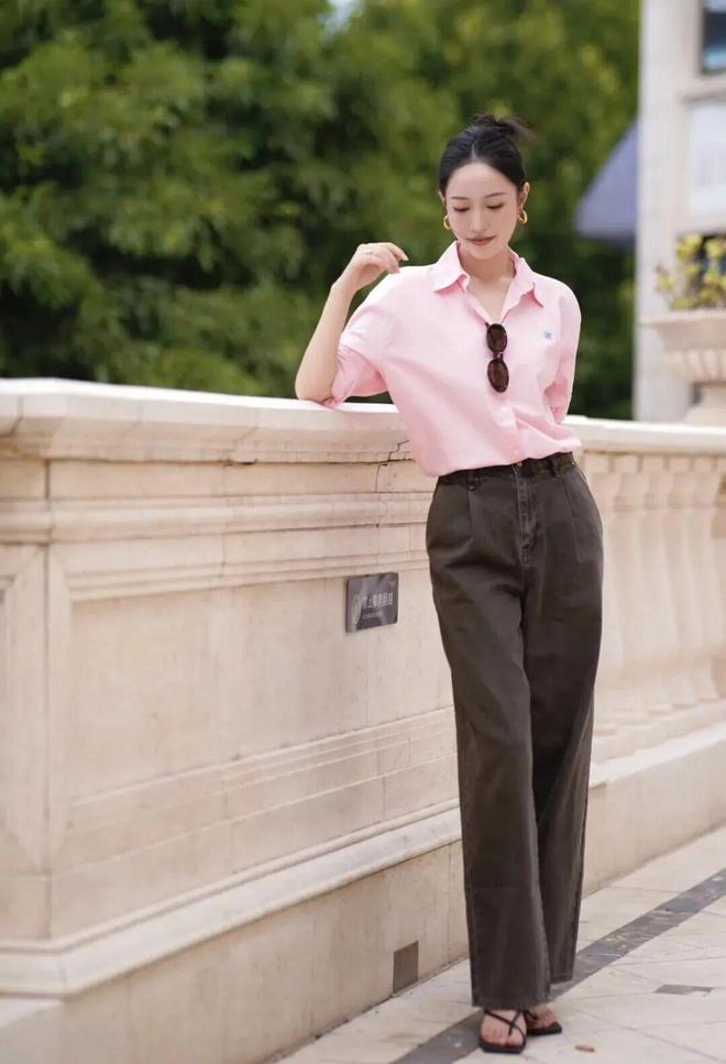 夏末的阳光与秋风相互交织,粉色的衬衫与宽松的深色裤子形成鲜明的对比,彰显了轻松自在的穿搭风格。简洁的款式与舒适的穿着让人感受到一种自由与轻盈,温暖又不失清新。▼