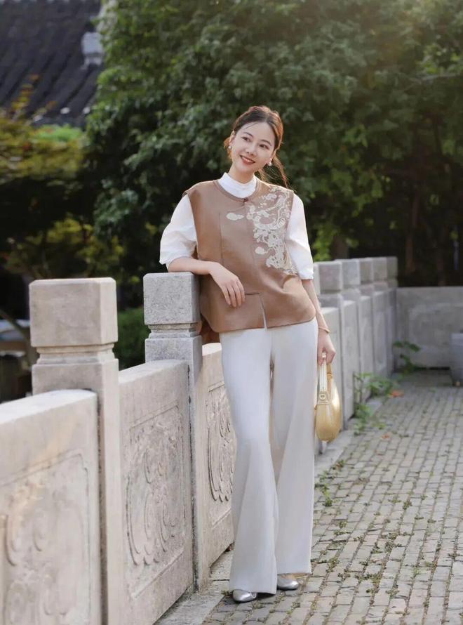 夕阳的余晖洒在古桥上,穿着浅棕色国风上衣与白色阔腿裤的她,站在桥头,笑意盈盈。这份温暖与秋日的柔和阳光相得益彰,整体搭配简约却充满细节,金色的包袋为造型增添了优雅的亮点。▼