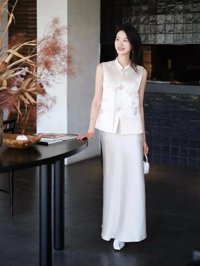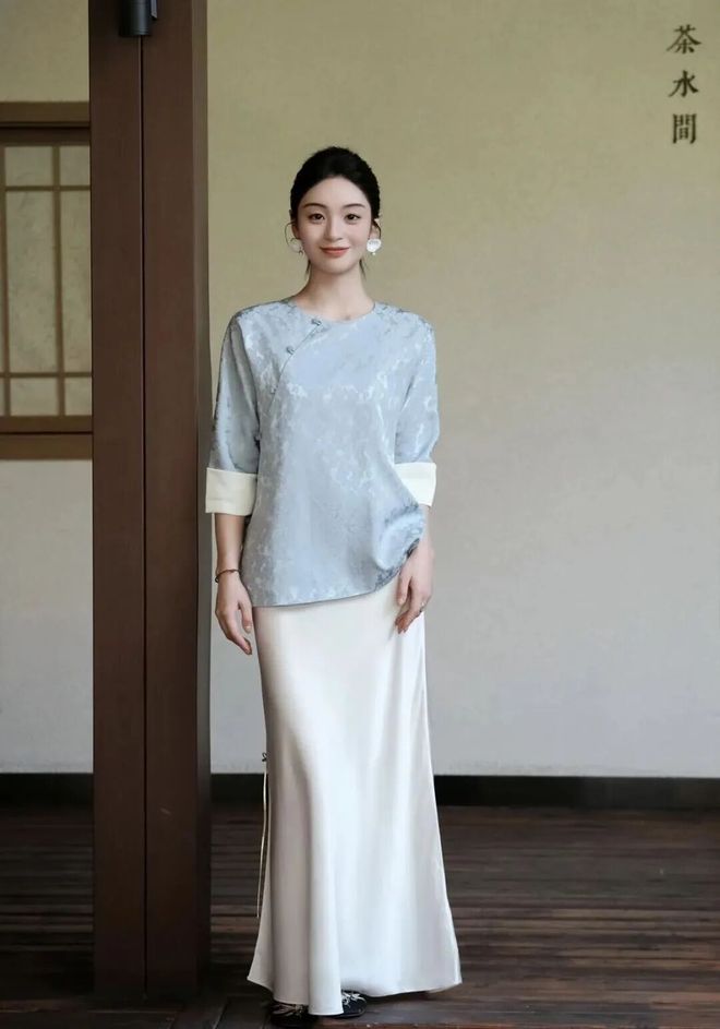 在安静的茶室里,淡蓝色刺绣国风上衣与白色长裙,站在木质的门框旁,轻盈而优雅。清新的蓝色与白色的搭配传达出一种宁静与柔和的气质,整体造型既现代又带着一丝古典的优雅,让人不禁沉醉在这份安静与美好之中。▼