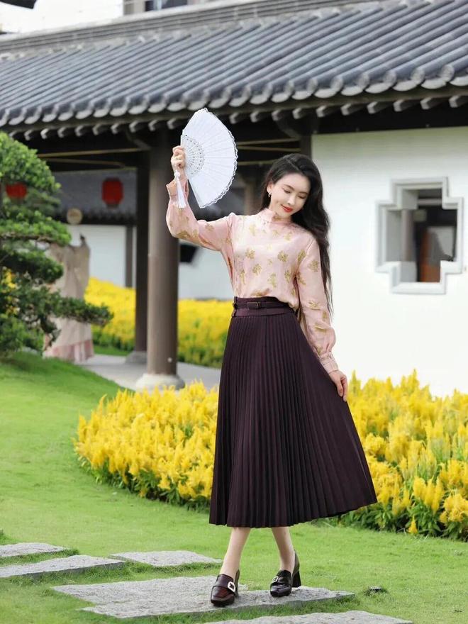 在这秋意渐浓的时节,穿着粉色花卉国风上衣与深色褶皱裙子的她,优雅地拿着折扇,站在古老的园林中。她的微笑与这一切的宁静和谐共融,仿佛一幅静谧的秋日画卷,充满了诗意与故事感。▼
